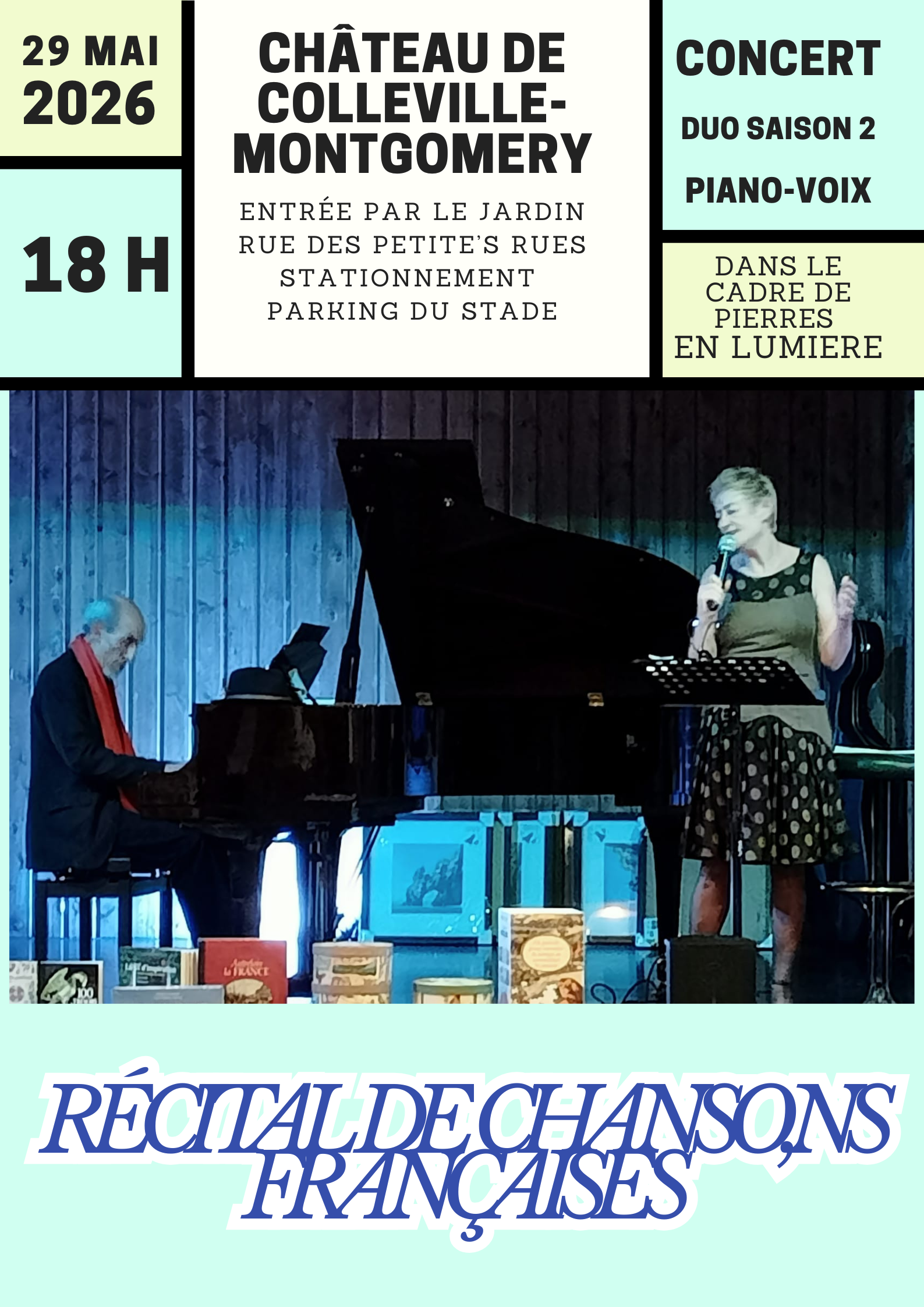 Dans le cadre de « Pierres en Lumière », venez au Château de Colleville-Montgomery, pour assister à un récital de chansons d’amour par le duo piano-voix Saison 2, constitué de Dominique Achille au piano et Corinne Le Bars au chant.