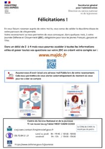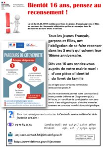 Observations : Démarche à faire par l’intéressé dans les 3 mois qui suivent le 16ème anniversaire. L’attestation remise est indispensable pour s’inscrire à un examen ou à un concours public (CAP, BEP, BAC, permis de conduire…), pour effectuer la Journée Défense et Citoyenneté et pour l’inscription d’office sur les listes électorales.